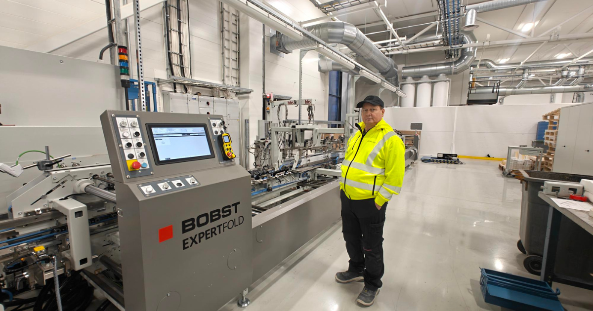 Production Supervisor Jari Tainio explains that the new BOBST Expertfold 110 A2 gluing line works in combination with the automatic Cartonpack 4 packing machine. Together, they speed up packing into corrugated boxes while significantly reducing manual work.
